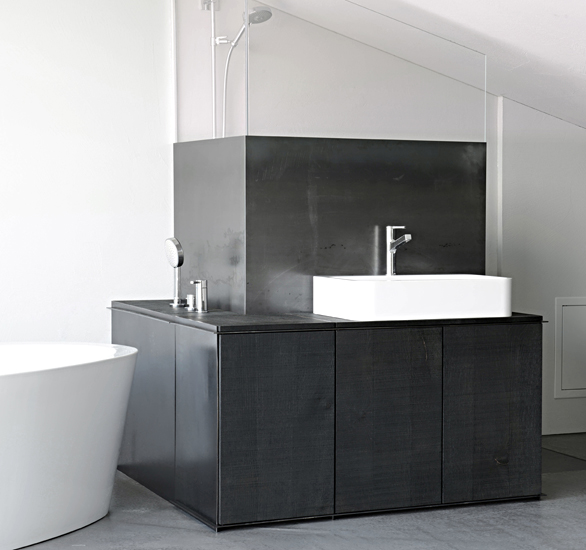 < > fronten eichenholz allseitig gesägt, eisenoxidiert, geölt und poliert. korpus und rückwand schwarzblech geölt.