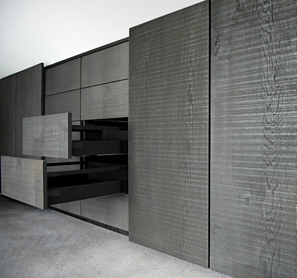 < > fronten eichenholz allseitig gesägt, eisenoxidiert, geölt und poliert. korpus eichenholz gehobelt.