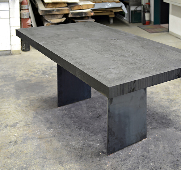 < > holz und stahl kombiniert. elegant verbunden. die gesägte holzoberfläche kontrastiert mit dem schwarzblech.