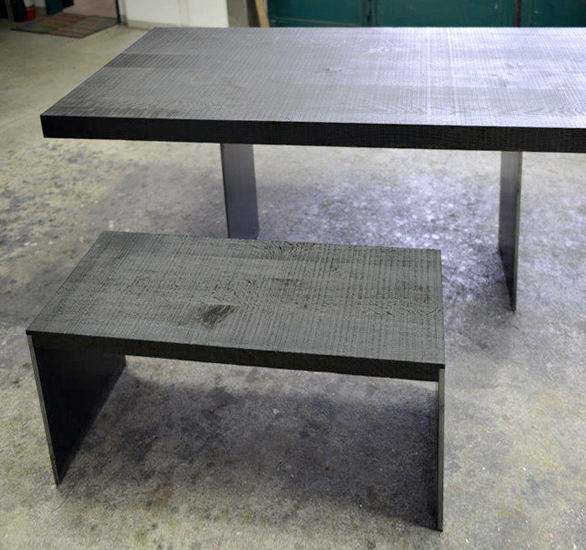 < > die bank – sitzgelegenheit passend zum tisch. eichenholz allseitig gesägt, eisenoxidiert, geölt und poliert. untergestell schwarzblech geölt.